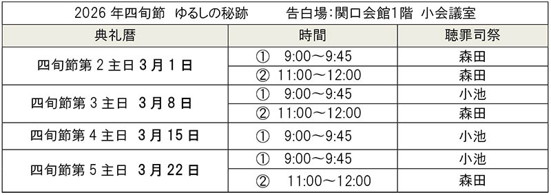 四旬節中、3月1日、8日、15日、22日に下記の日程でゆるしの秘跡を受けることができます。